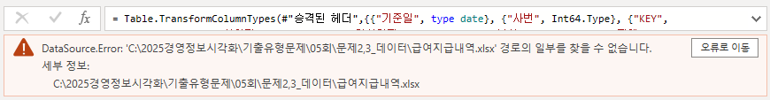 시험장에서 그럴 일은 없지만 인터넷에 올라와 있는 실기 연습 파일 중에 경로 설정이 제대로 되어 있지 않아 오류가 생기는 경우가 있다. 파워쿼리 편집기에서 다음과 같은 오류가 뜬다.